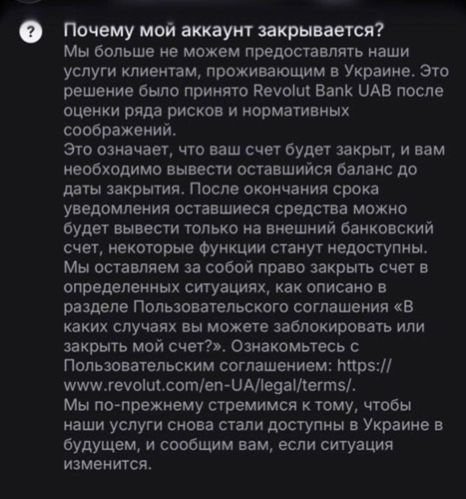 Читать далееRevolut закрывает счета украинцев из-за требований законодательства