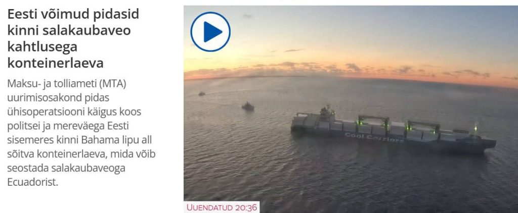 В ходе совместной операции Следственный отдел Налогово-таможенного управления Эстонии (ETCB) совместно с полицией и военно-морским флотом задержал в внутренних водах Эстонии контейнеровоз «Балтийский дух» под флагом Багамских островов, который может быть связан с контрабандой товаров из Эквадора. Согласно неподтвержденным сообщениям, на борту судна могли находиться наркотики. Специальное подразделение полиции К-Коммандо поднялось на борт судна, после […]